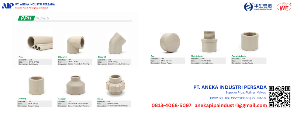Untuk mendukung kinerja dan produktivitas industri, maka dibutuhkan produk-produk yang berkualitas, PT. Aneka Industri Persada menyediakan produk-produk Pipa PPH berkualitas dari brand ternama dan terpercaya yaitu Huasheng Cenit dan WF.