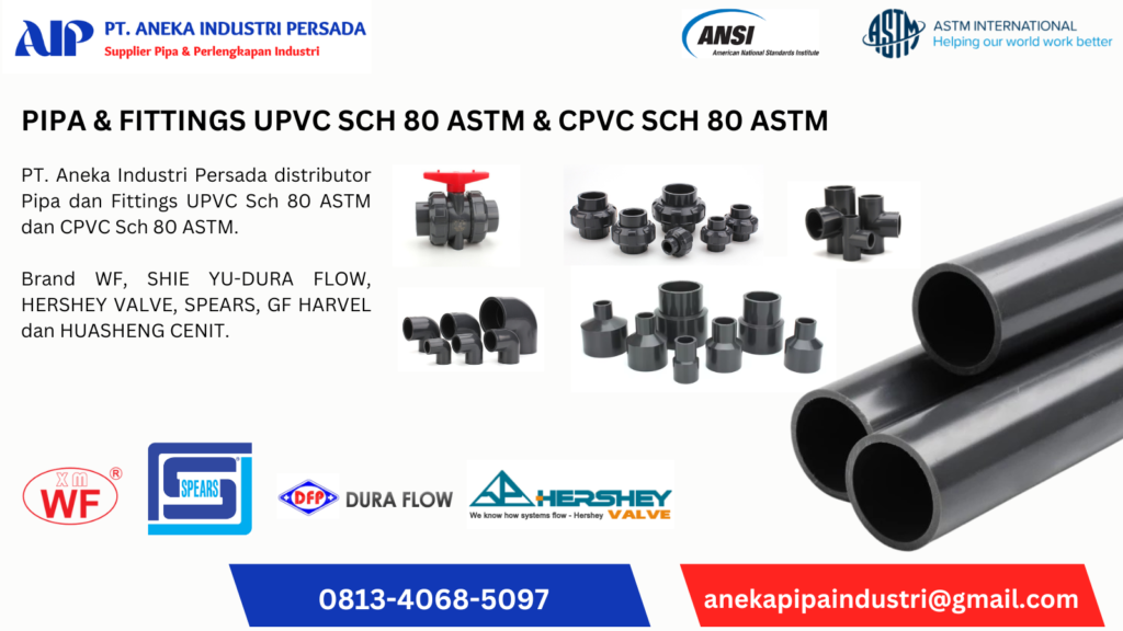 Pipa dan Fitting UPVC Sch 80 dan CPVC Sch 80 memenuhi standard ASTM (ANSI) dalam proses produksinya. Menjadikan Pipa dan Fitting UPVC Sch 80 dan CPVC Sch 80 merupakan material Thermoplastik yang resistant terhadap kimia dan korosi pada tingkat yang lebih baik, dan dapat diaplikasikan pada pressure yang tinggi untuk sistem pipa pengairan diberbagai bidang industri.