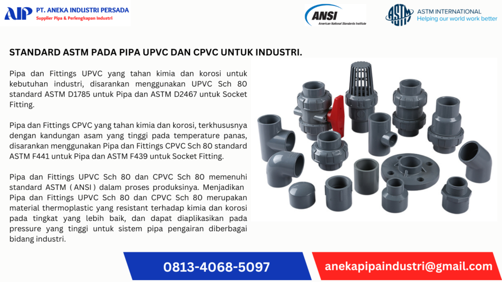 Pipa dan Fittings UPVC yang tahan kimia dan korosi untuk kebutuhan industri, disarankan menggunakan UPVC Sch 80 standard ASTM D 1785 untuk Pipa dan ASTM D 2467 untuk Socket Fitting.